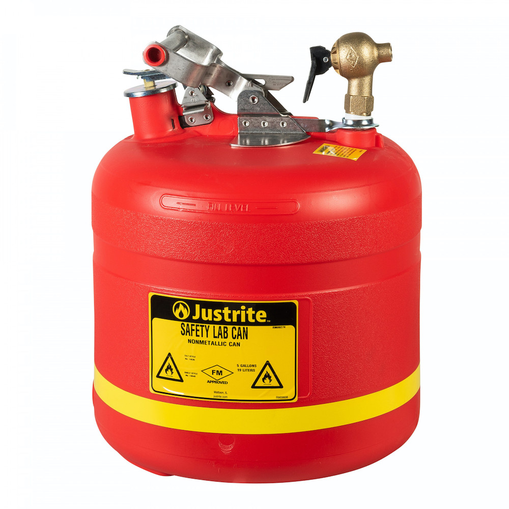 Nonmetallic Laboratory Safety Cans have all the benefits of Justrite’s Type I polyethylene safety cans, with the addition of a self-closing faucet for easy dispensing. All fill spouts have a pressure-relief cap with stainless steel flame arrester. Hardware featured on the can top is stainless steel for maximum corrosion resistance and long life. The five-gallon size also features a vacuum-relief valve in the lid allowing liquids to flow smoothly. Justrite’s unique patented, current-carrying carbon insert imbedded into the container provides for proper grounding.