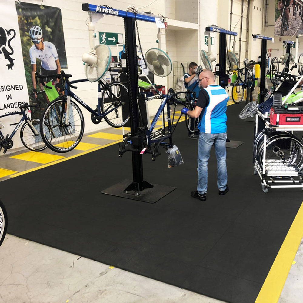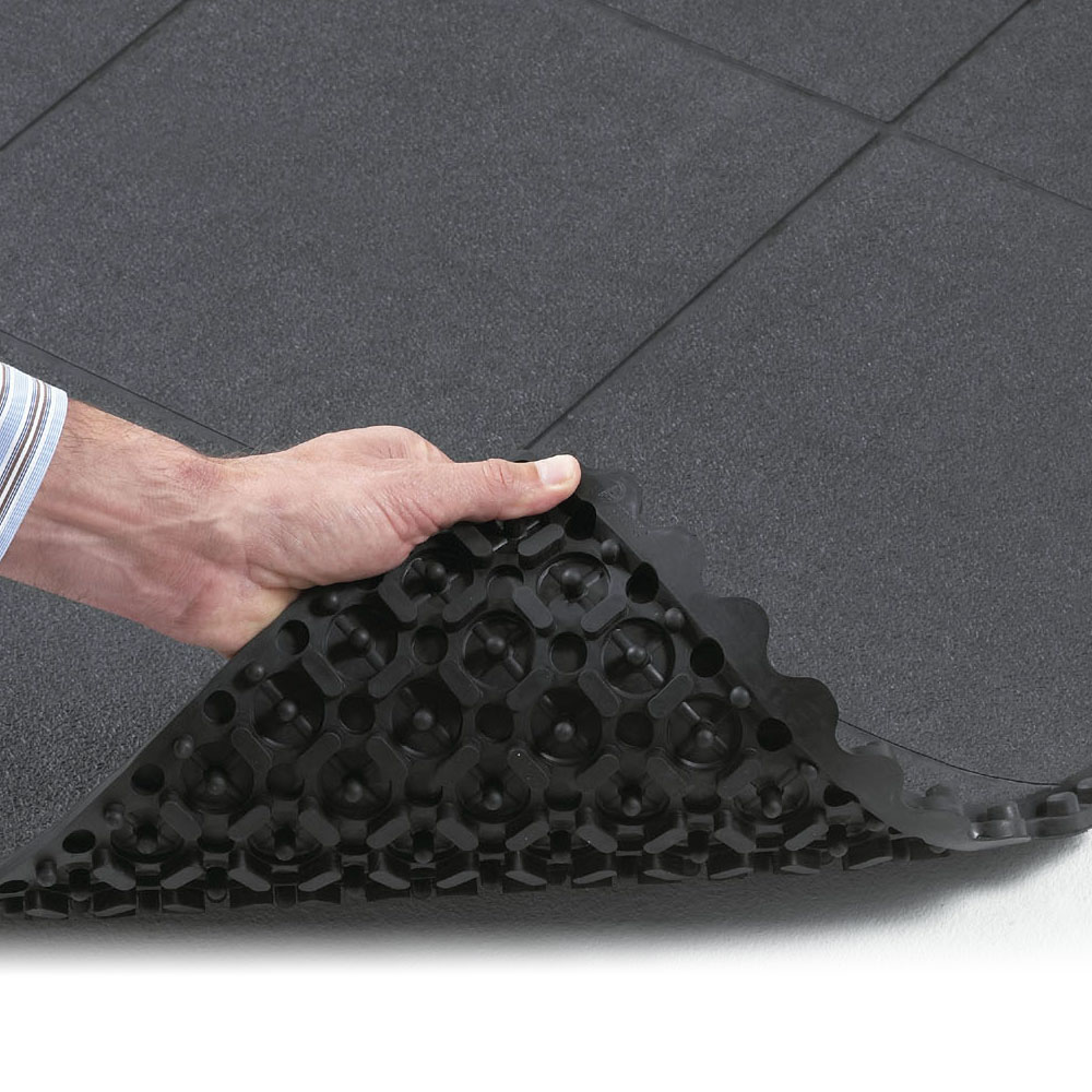 Heavy-duty rubber tiles of 91 cm x 91 cm can be easily assembled for coverage of large areas or individual workstations, wall-towall or as islands. Ergonomic benefit derived from a 19 mm thick worker platform with a closed anti-slip pebble structure surface for maximum anti-fatigue comfort in dry industrial environments. Compatible with patented MD Ramp System™ for smart safety bevelling solutions; allow out and inside corners. Slip resistance rating R9 according to DIN 51130.