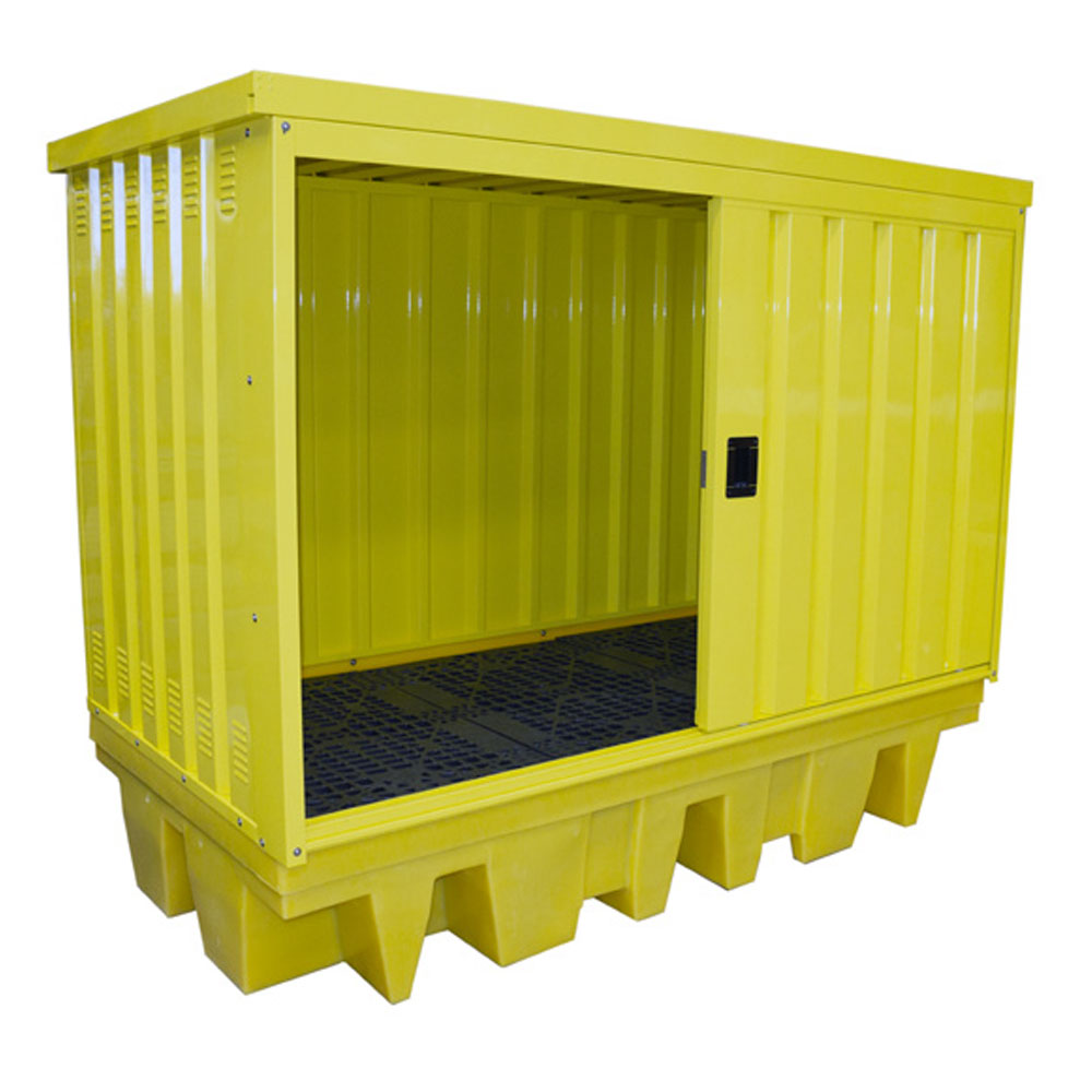 Manufactured from medium-density polyethylene this spill pallet, designed to hold 8 x 205ltr drums or 2 x 1000ltr IBC has a 0.6mm galvanised steel (powder-coated paint finish) cover with access via 2 steel sliding doors (fitted with a central lock). The galvanised steel cover is attached to the spill pallet by means of M8 dome head Allen bolts & nyloc nuts.