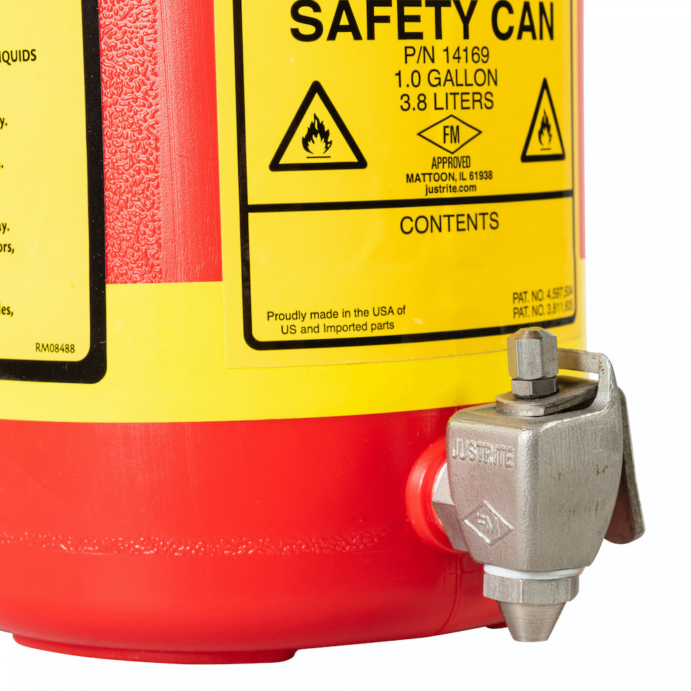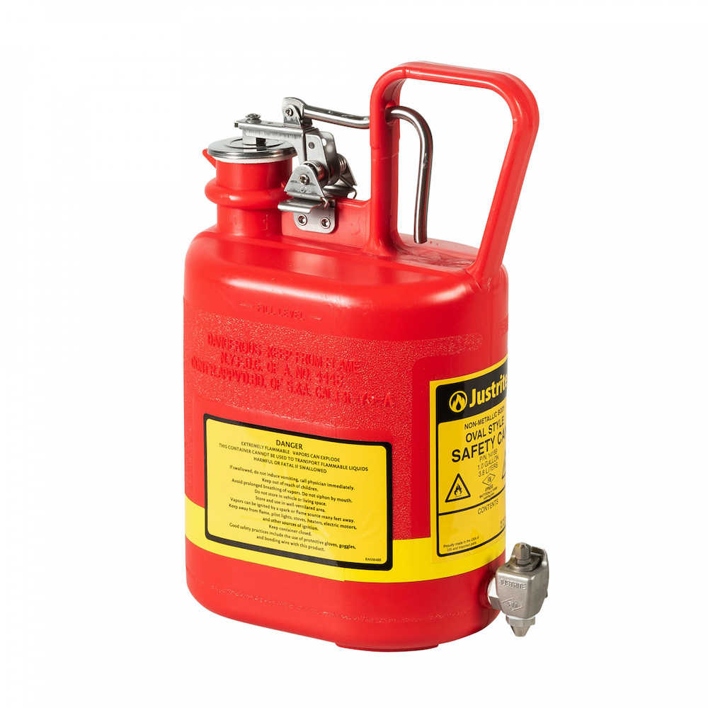Nonmetallic Laboratory Safety Cans have all the benefits of Justrite’s Type I polyethylene safety cans, with the addition of a self-closing faucet for easy dispensing. All fill spouts have a pressure-relief cap with stainless steel flame arrester. Hardware featured on the can top is stainless steel for maximum corrosion resistance and long life. The 5-gallon size also features a vacuum-relief valve in the lid allowing liquids to flow smoothly. Justrite’s unique patented, current-carrying carbon insert embedded into the container provides for proper grounding.