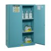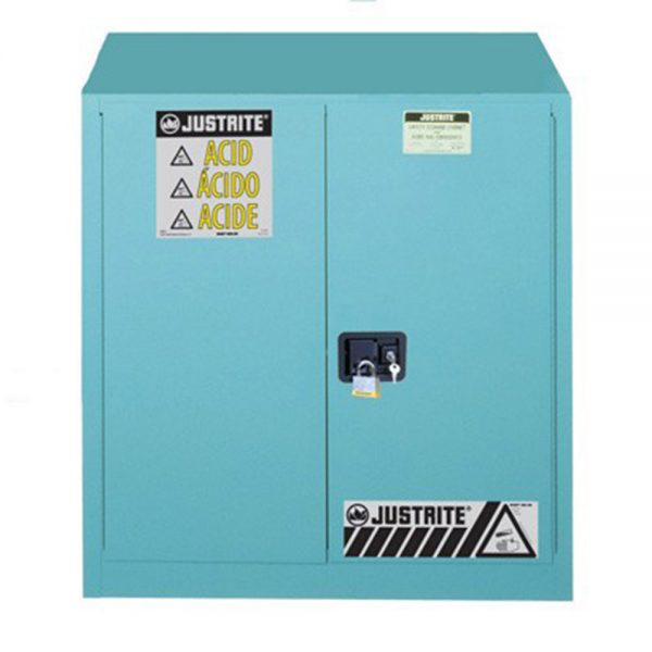 Justrite blue steel safety cabinets for corrosives have the same quality safety features as the cabinets for flammables. All models come with double-wall construction, dual vents, grounding wire connections, adjustable shelves, leakproof sills, three-point self-latching doors and leveling feet. Self-close door(s) shuts and latches automatically when a fusible link melts at 165°F (74ºC) under fire conditions. Unique, concealed self-closing mechanism offers obstruction-free access to contents.