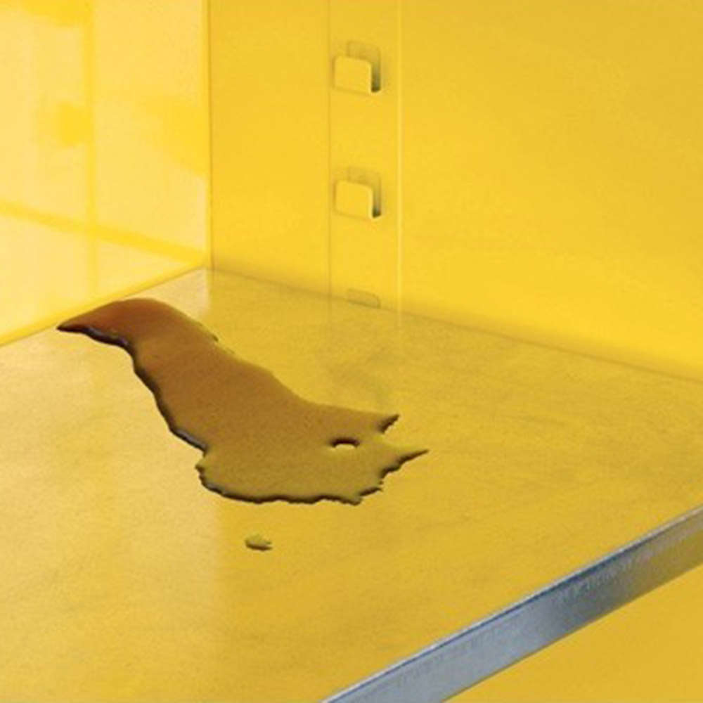Patented SpillSlope® galvanized steel shelves direct spills to back and bottom of a leakproof 2-in (51-mm) bottom sump. They adjust on 3-in (76-mm) centers for versatile storage. Cabinets also feature dual vents with flame arresters, four adjustable self-leveling feet, grounding connector, and trilingual warning label. Durable lead-free epoxy/polyester powder-coat finish provides excellent chemical resistance.