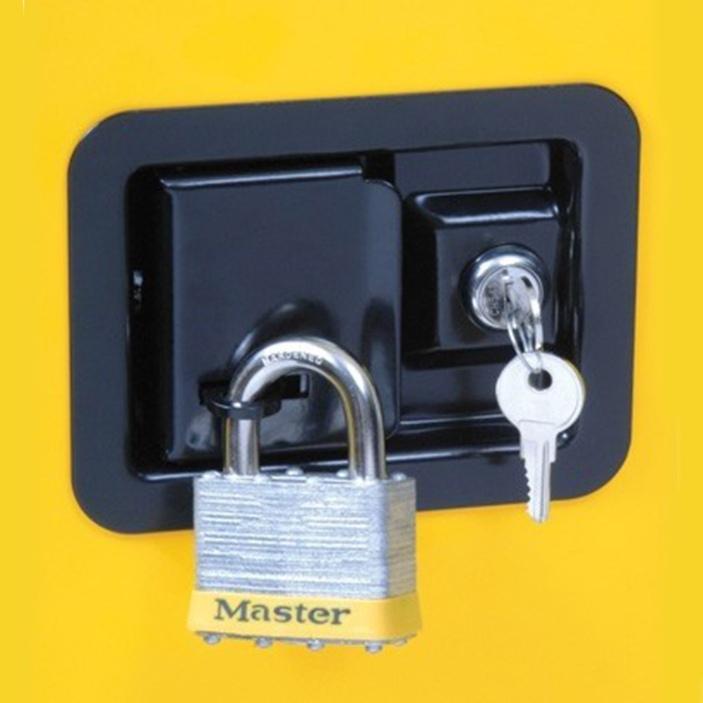 Protect workers, reduce fire risks, and improve productivity by storing flammable fuels and chemicals in code-compliant safety cabinets. Designed to meet OSHA and NFPA standards, Sure-Grip® EX cabinets are constructed of sturdy 18-gauge (1-mm) thick double-wall, welded steel with 1-1/2-in (38-mm) of insulating air space for fire resistance. High-performance, self-latching doors close easily and securely for maximum protection under fire conditions. Fail-safe closing mechanism ensures three-point stainless steel bullet latching system works every time.