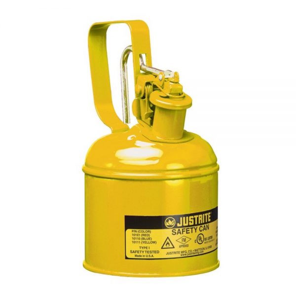 Made from high-grade coated steel, each can is tested to guarantee 100% leakproof construction. The tough powder-coat finish resists chemicals and stands up to demands of rigorous use. Each Justrite safety can is equipped with a stainless steel flame arrester which dissipates heat to stop flashback ignition. Cans up to 1 quart (1L) feature a trigger-release handle, while larger capacities have a swinging handle to greatly ease carrying of heavier loads.